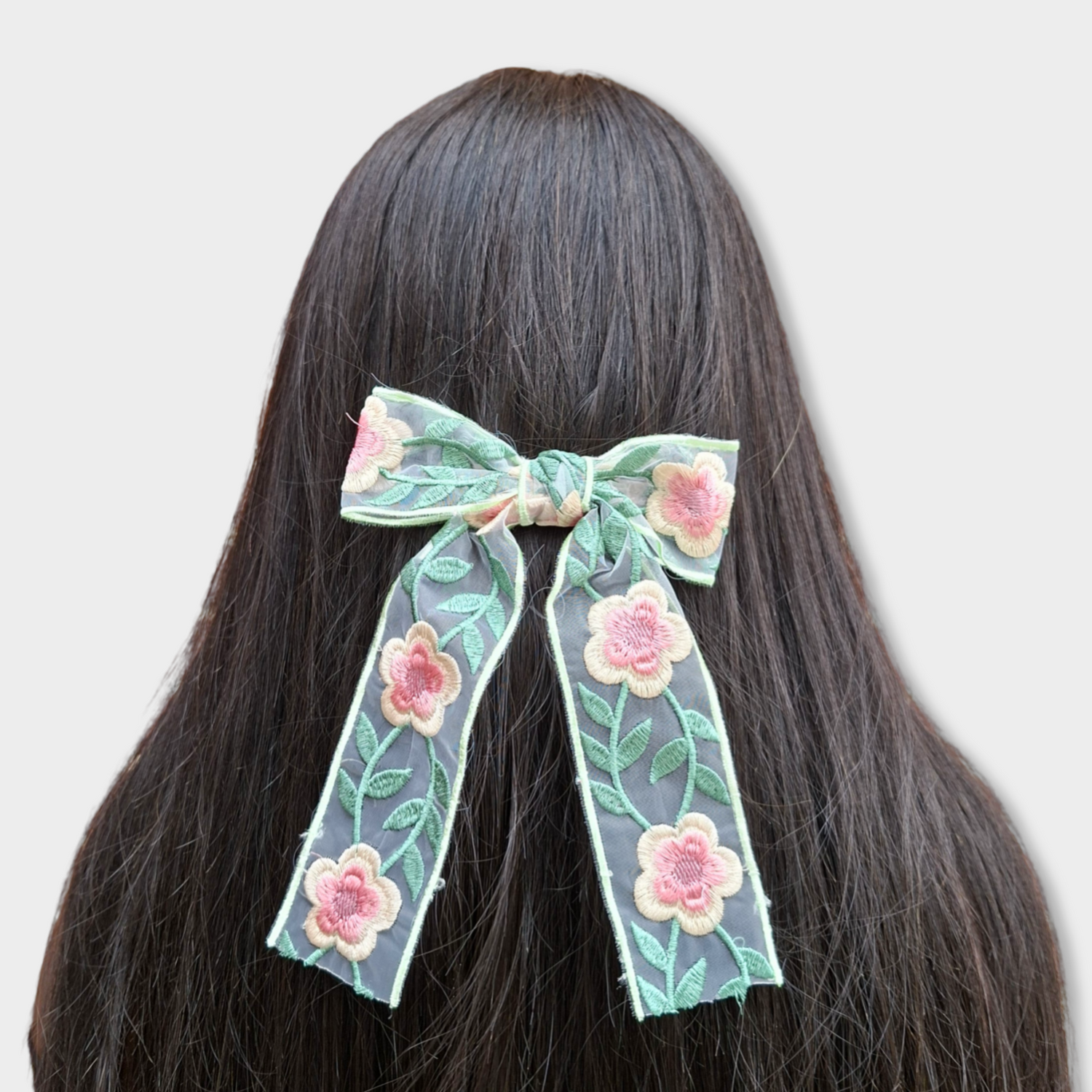FLORAL EMBROIDERED ORGANZA BOW BARRETTE